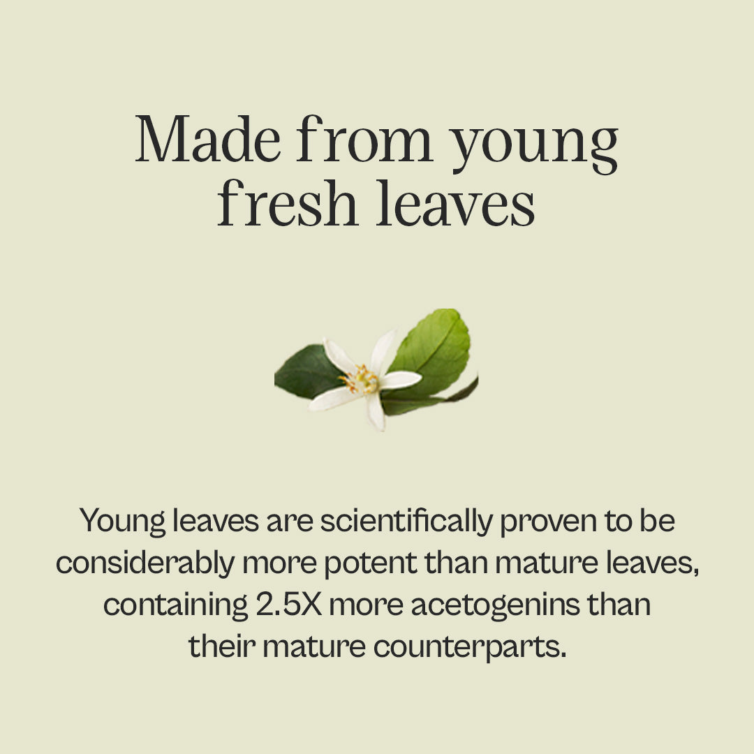We’ve known of the natural goodness inside the graviola plant for years, but we didn’t settle for good. In this bottle, we’ve achieved graviola greatness. Of course, it all starts at the source. We only choose the young and most potent leaves, picked at peak freshness, which then leads to our unique maceration process: We compress and concentrate the essence of this amazing plant, adding only vegetable glycerin and natural spring water to create a tincture bursting with benefits.